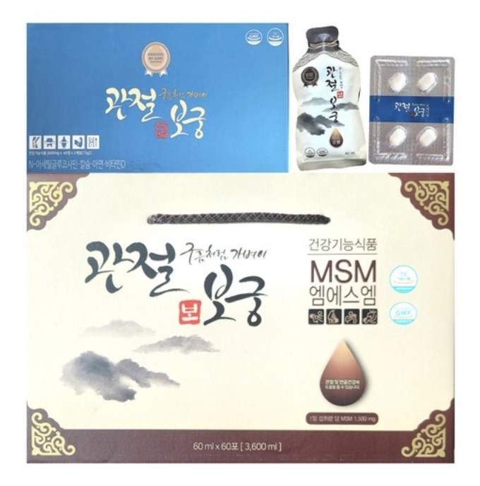 - 마시는 '보'(액상): 흡수가 빠른 액상 형태입니다. 관절 통증과 염증을 잡는 주성분인 MSM을 고농축으로 담아 체내에 빠르게 전달합니다.