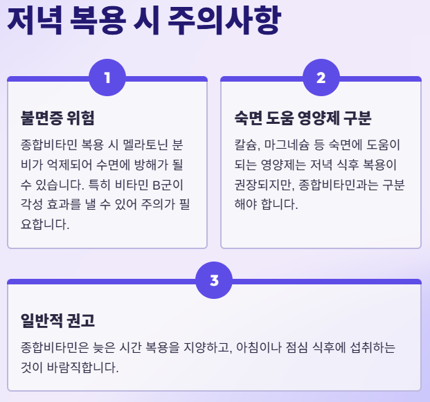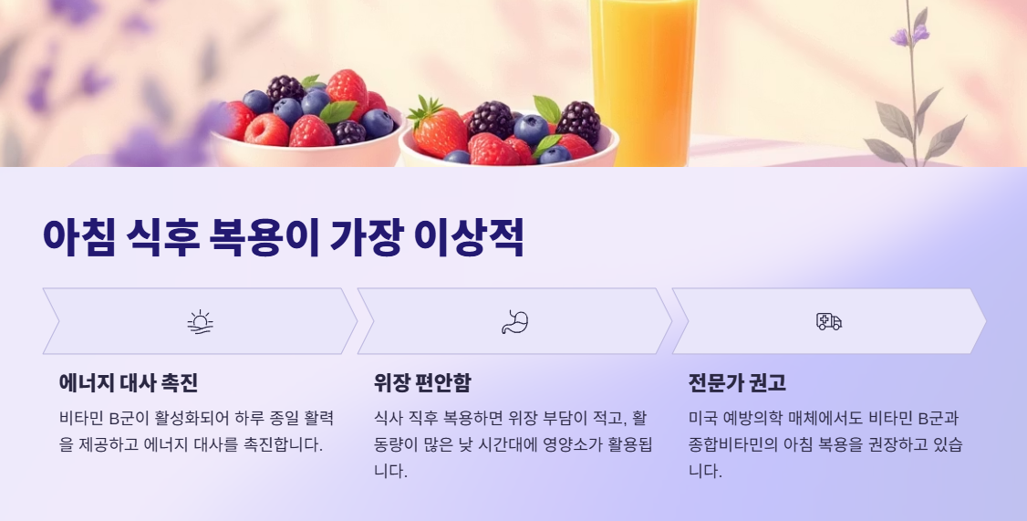 저녁 늦게 고함량 비타민 B군을 섭취하면 신진대사가 활발해져 수면에 방해가 될 수 있으니, 가급적 '점심 식사 직후'를 추천합니다.