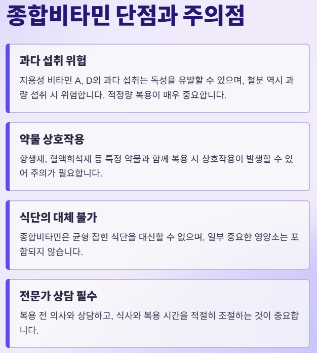 모든 영양제가 그렇듯 종합비타민도 만병통치약이 아닙니다. 장점은 명확하지만, 잘못 섭취했을 때의 단점 또한 존재합니다. 이를 알고 먹는 것이 '스마트 컨슈머'의 첫걸음입니다.