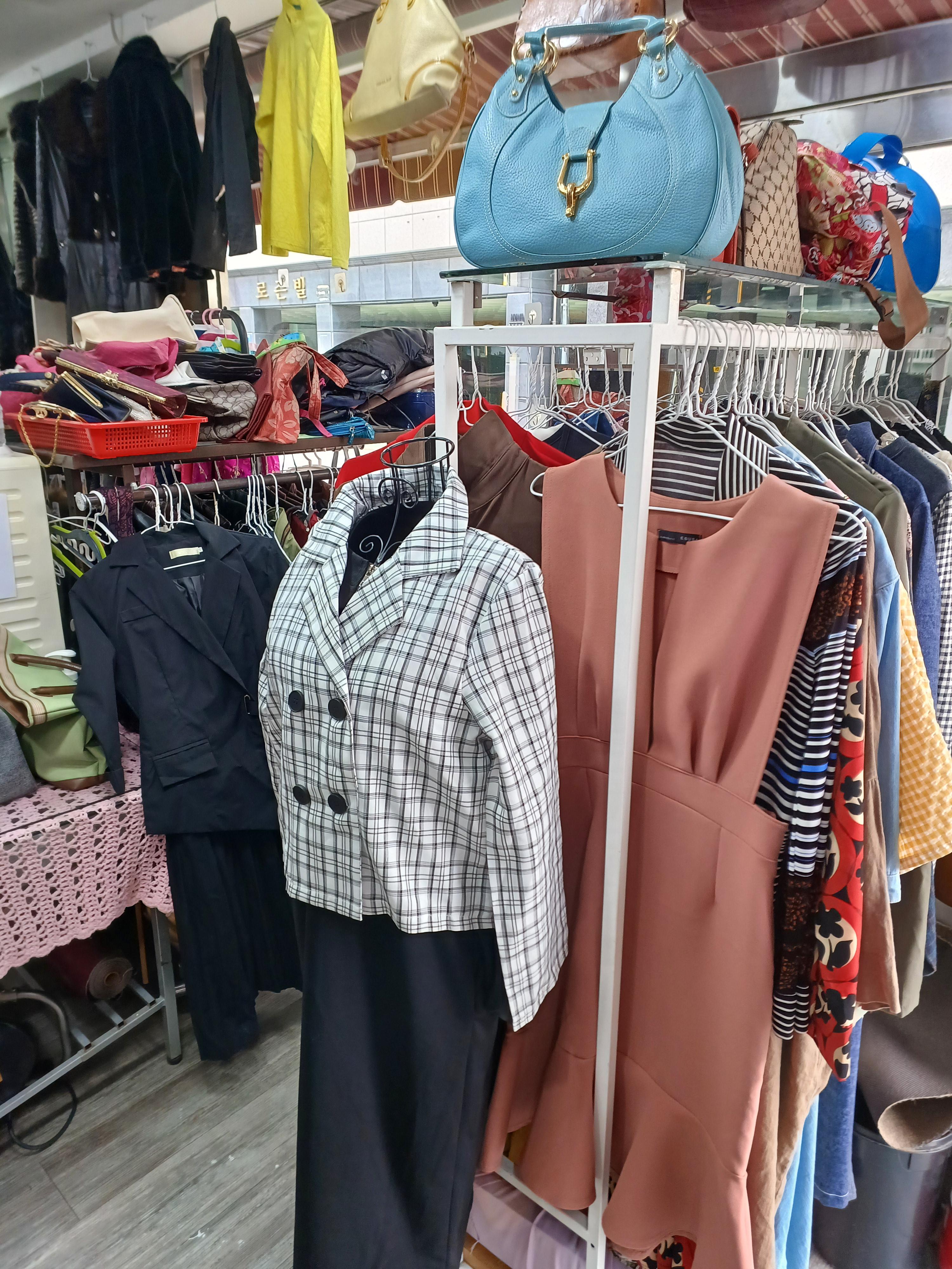 가장 큰 비중을 차지하는 것은 역시 여성 의류였습니다. 계절에 맞는 자켓, 원피스, 블라우스는 물론이고 청바지까지 다양한 스타일이 구비되어 있었습니다. 사진 속 핑크색 토트백이나 시크한 블랙, 블루 컬러의 핸드백처럼 포인트가 될 만한 가방들도 눈에 띄었습니다.