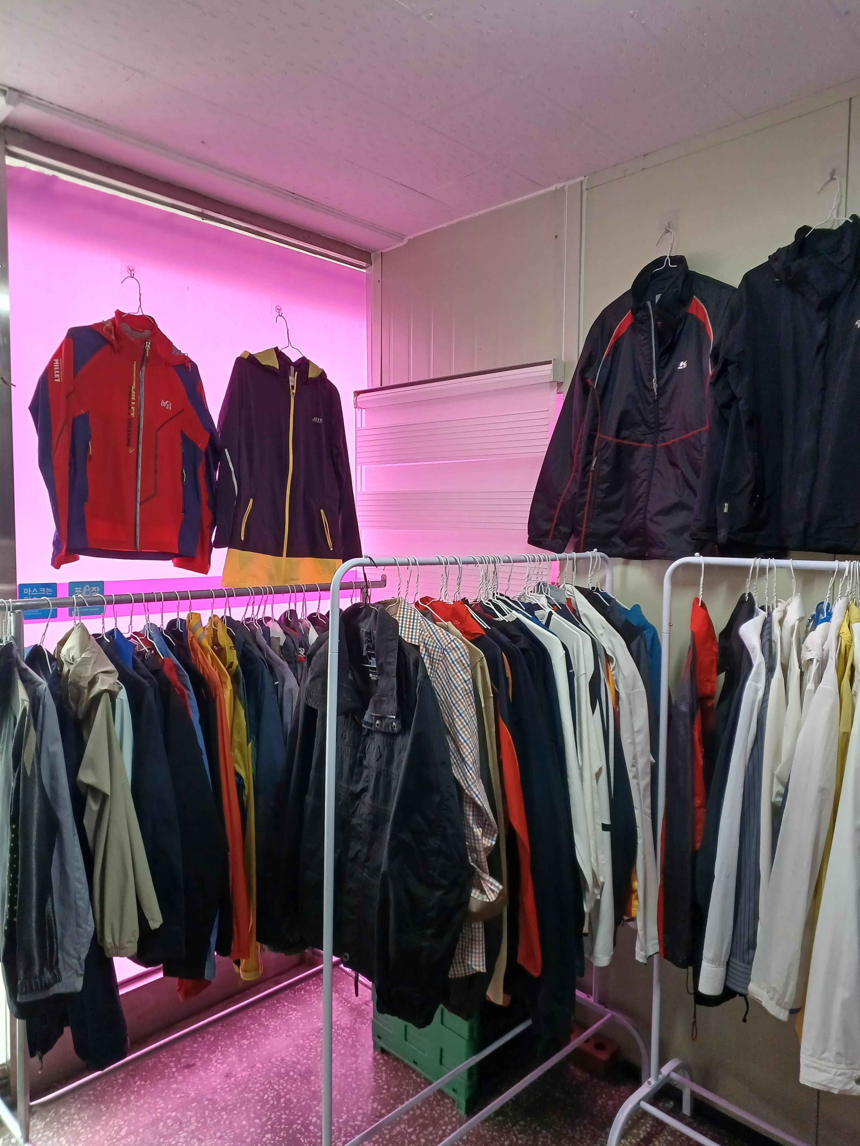 특히 상태 좋은 등산 자켓이나 바람막이, 캐주얼한 체크 셔츠 등은 활동적인 남성분들에게 큰 인기를 끌 것 같았습니다. 자세히 살펴보니 유명 아웃도어 브랜드의 제품들도 간간이 보였어요. 합리적인 가격에 고기능성 아우터 를 '득템'할 수 있는 절호의 기회입니다.